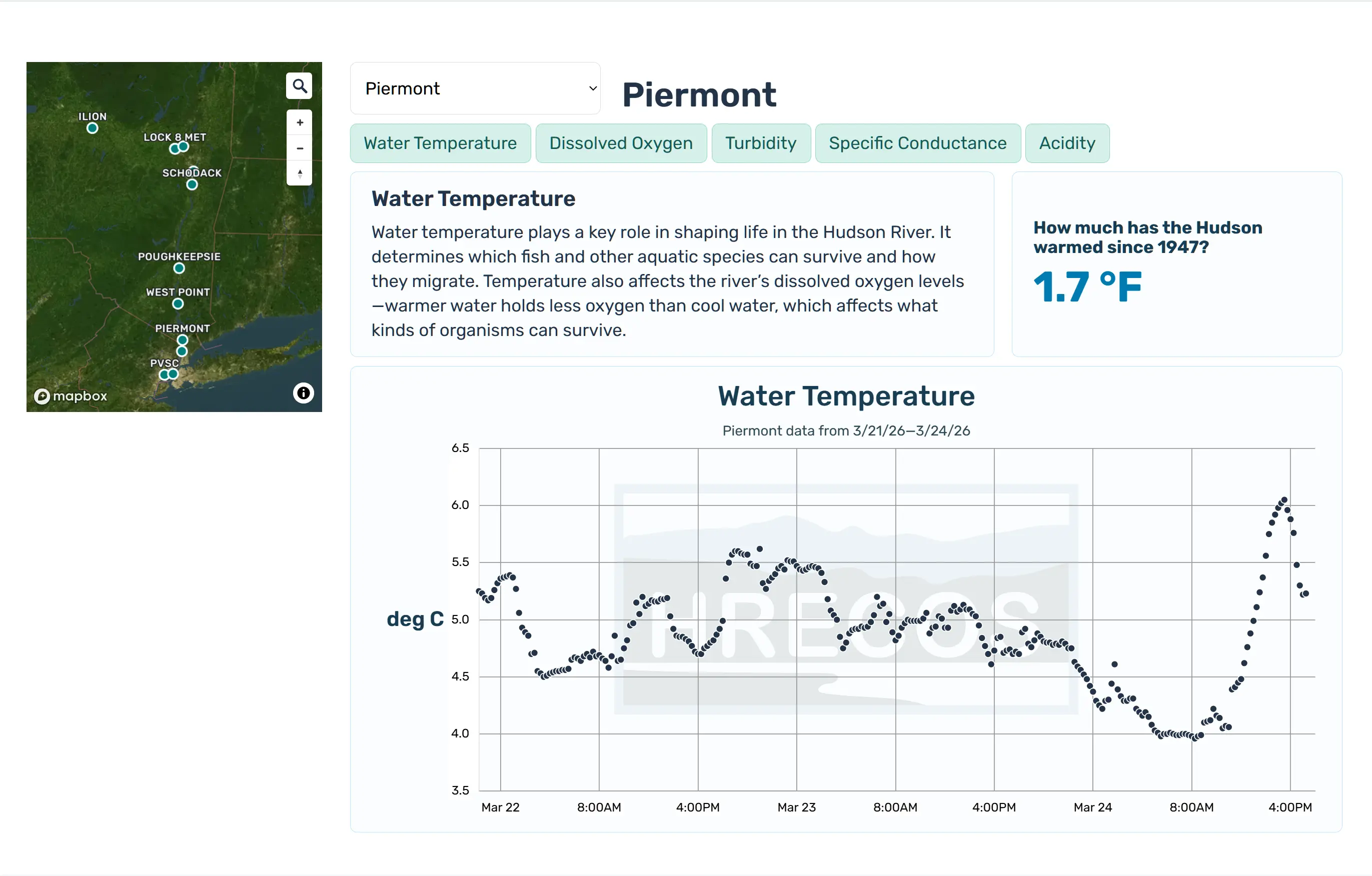 Want to know the water temperature near you? Our 15 monitoring stations track conditions in and along the Hudson, providing real-time data on water quality, weather, and more.See Current Conditions